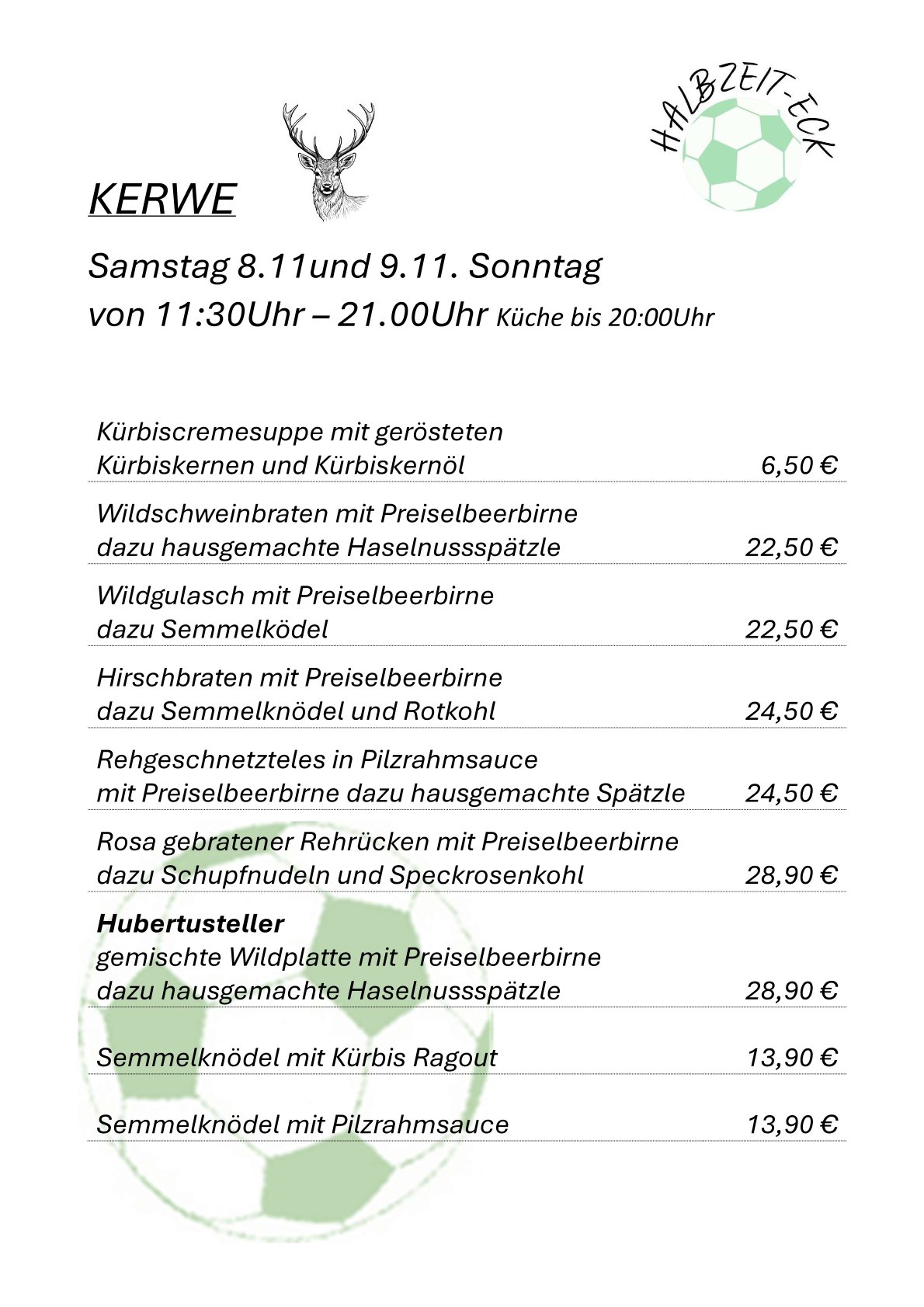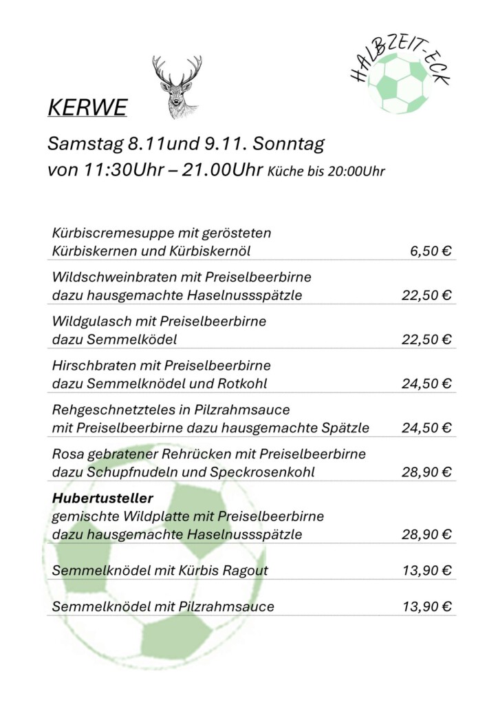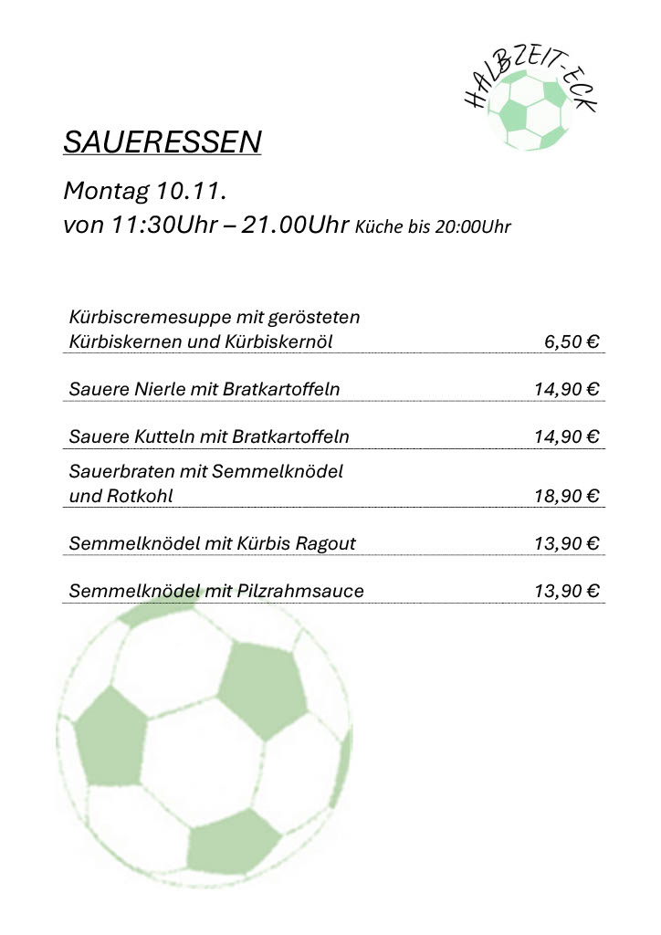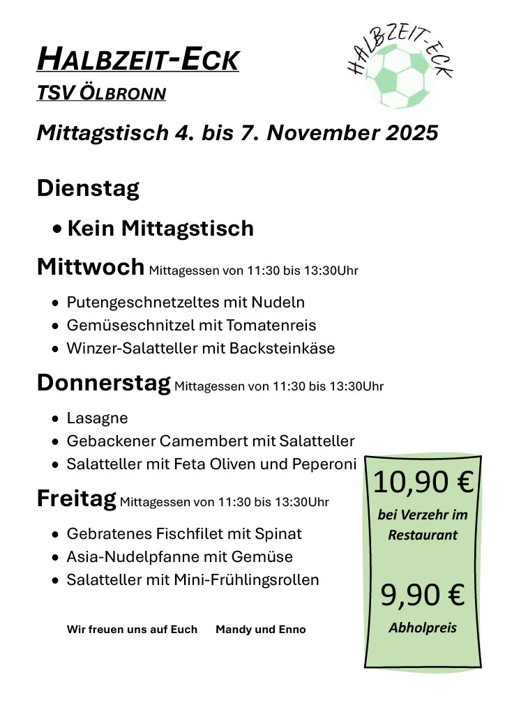 Das „Halbzeit-Eck“ bietet von Dienstag bis Freitag ein Mittagstisch mit 3 abwechslungsreichen Gerichten an. Ab November wird es auch eine kleine Karte mit Klassikern für das Mittagsgeschäft geben von 11.30Uhr bis 14:00Uhr geben. Zum Verzehr im Restaurant oder aber auch zum Mitnehmen.